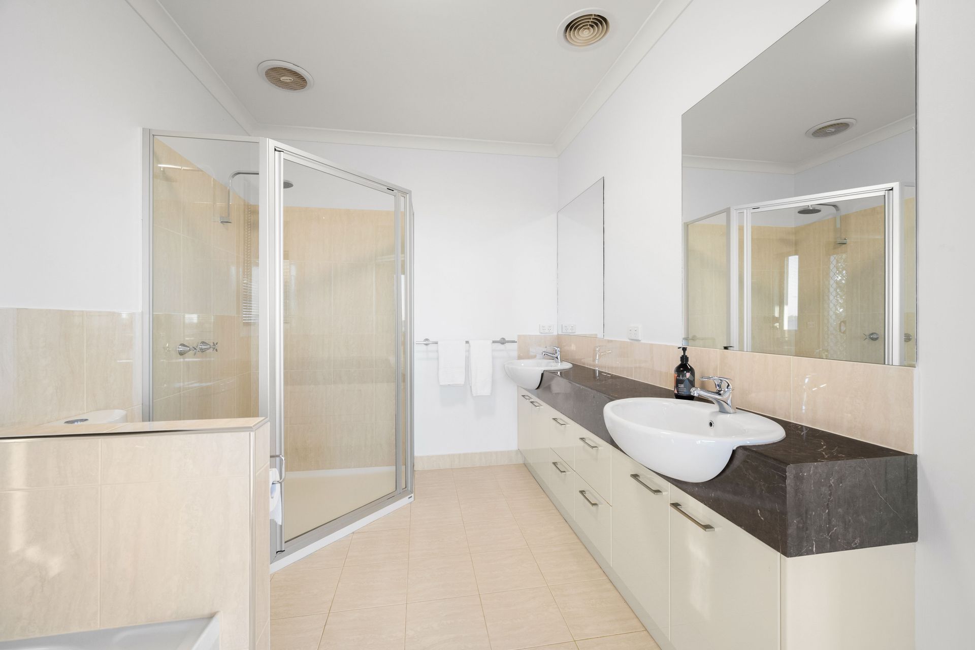 Enjoy views to Lake Mulwala from the upstairs balcony off the master bedroom featuring king size bed, built in robe and serviced by a generous sized ensuite with double sinks and small soaking bath.