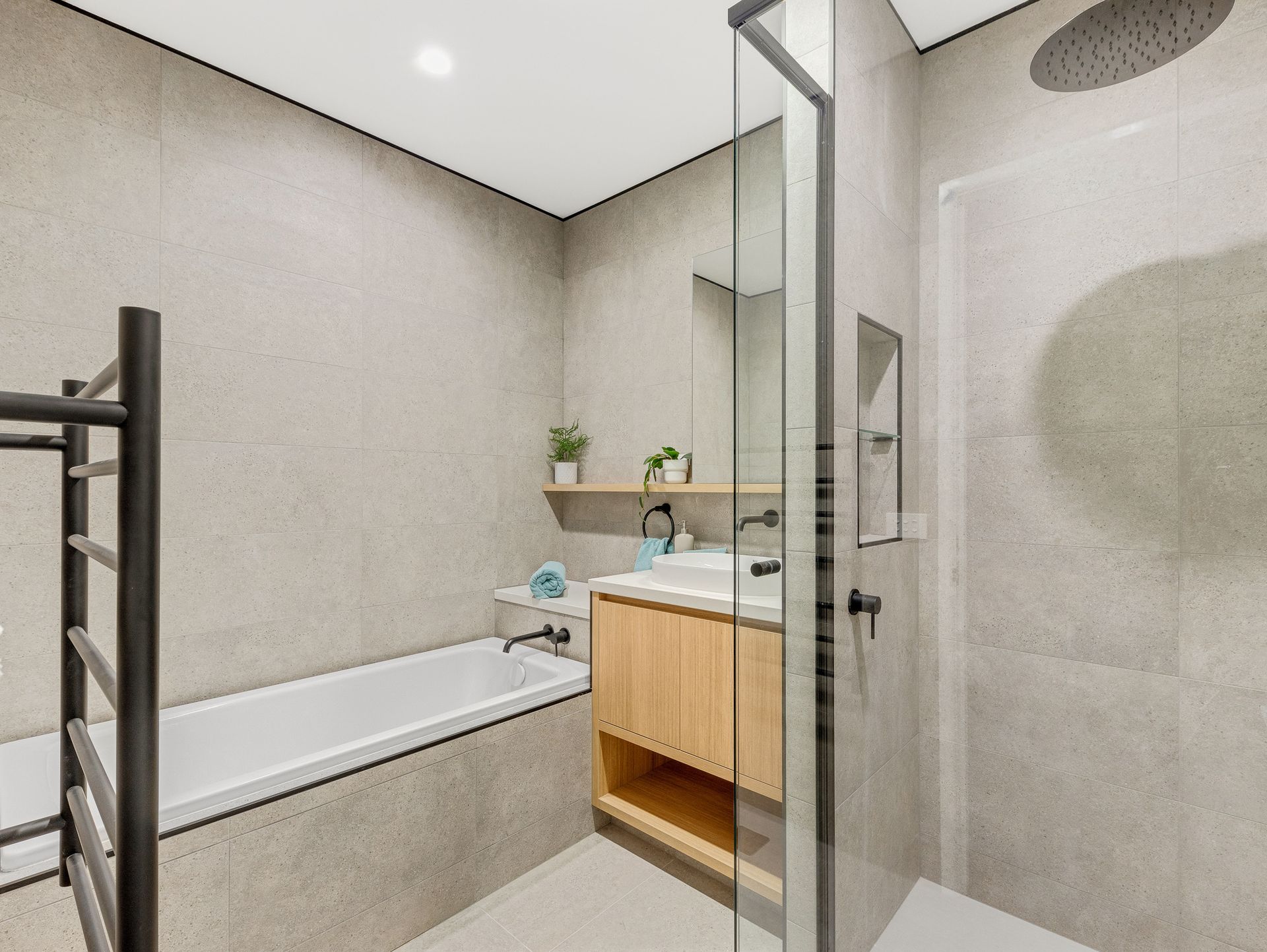 The outdoor area? Absolute paradise! Slide open the glass doors to a covered sitting area with a BBQ that overlooks a shared tropical pool that'll make you feel like you're on vacation. Hot day? The motorized awning's got your back. Chilly evening? The overhead heat bar will keep you toasty and comfortable.