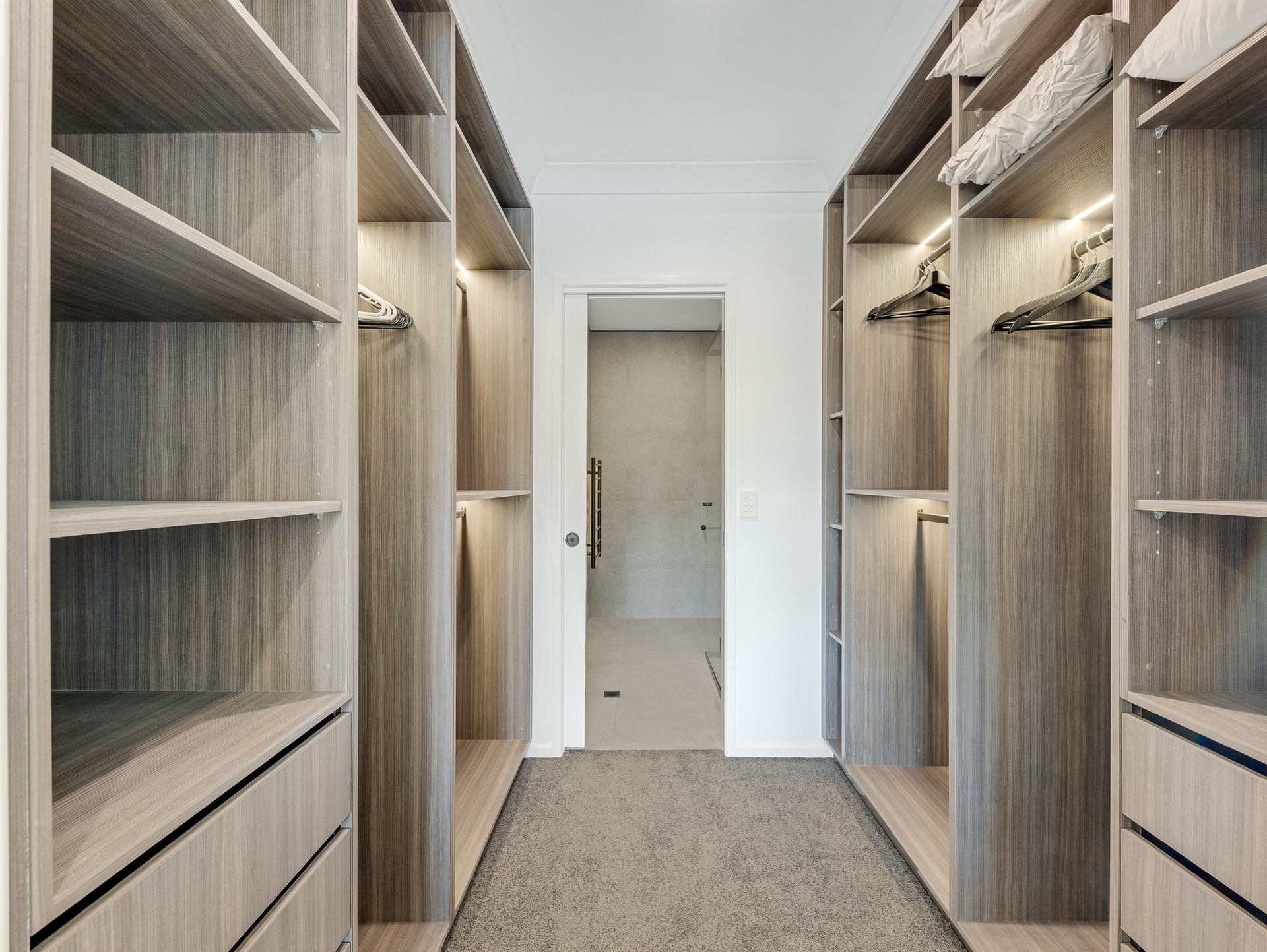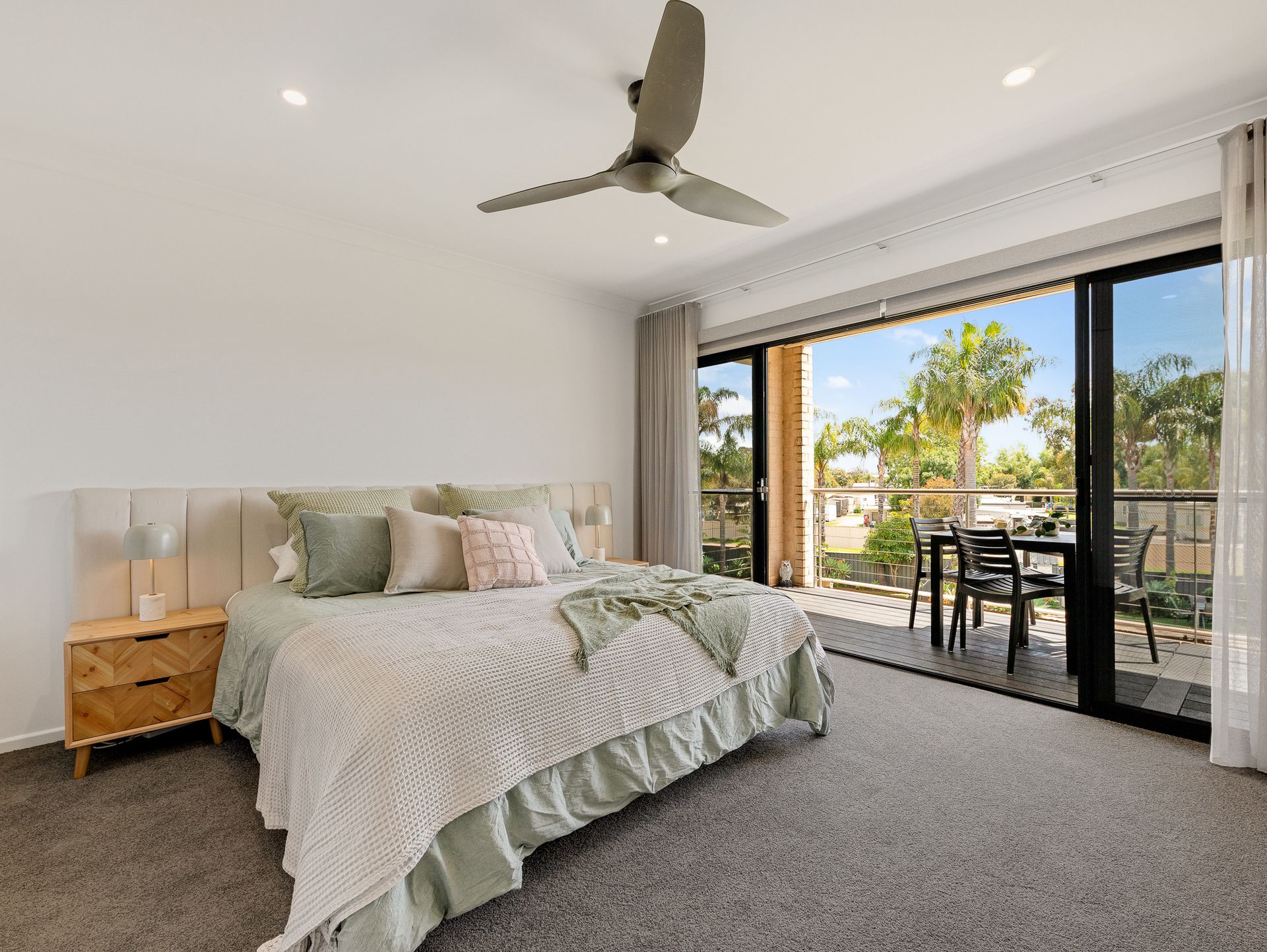 • Master bedroom with a king bed, ensuite, walk-through robe, and balcony views of the pool and lake