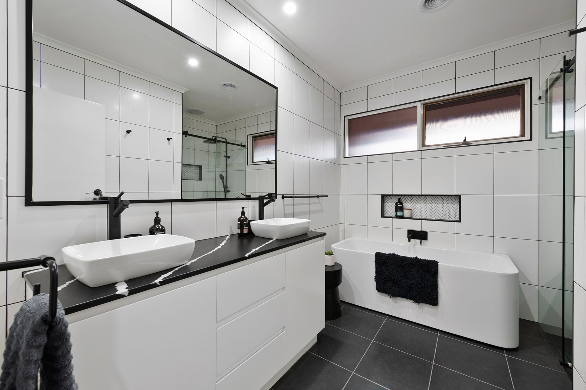 The modern family bathroom has all the necessities with bath, shower and separate toilet.
