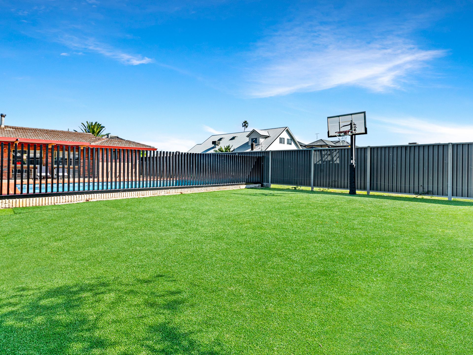 Outside, you'll find a fully fenced pool (not heated) and a grass play area with a basketball hoop - perfect for keeping everyone entertained.