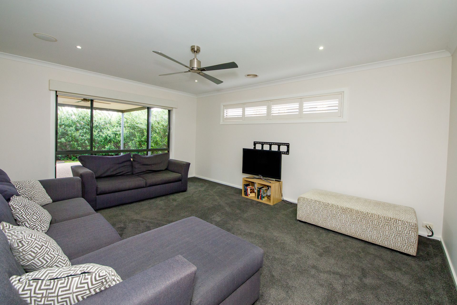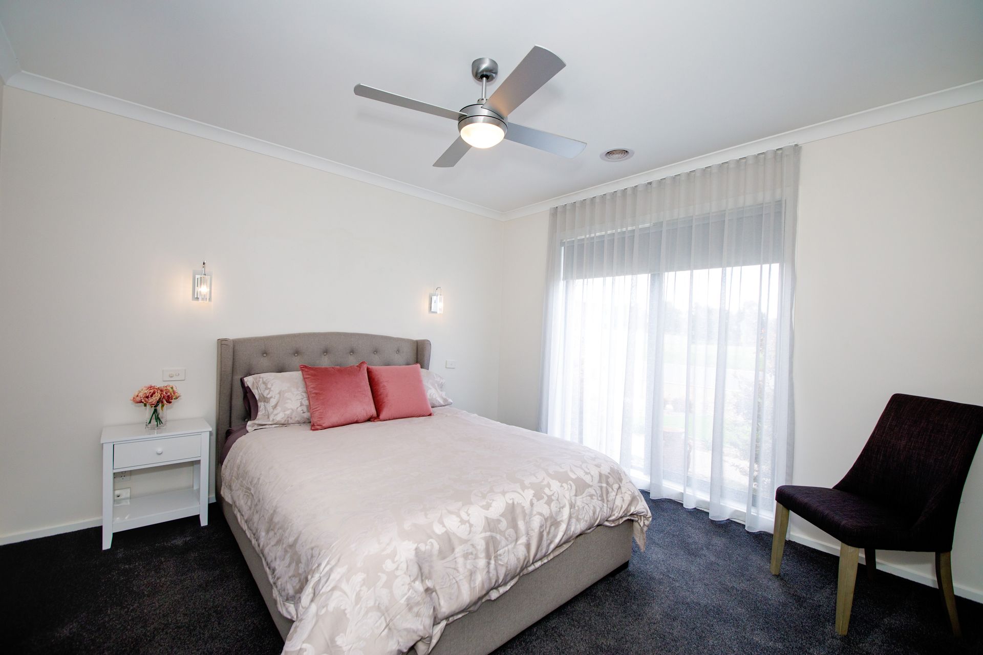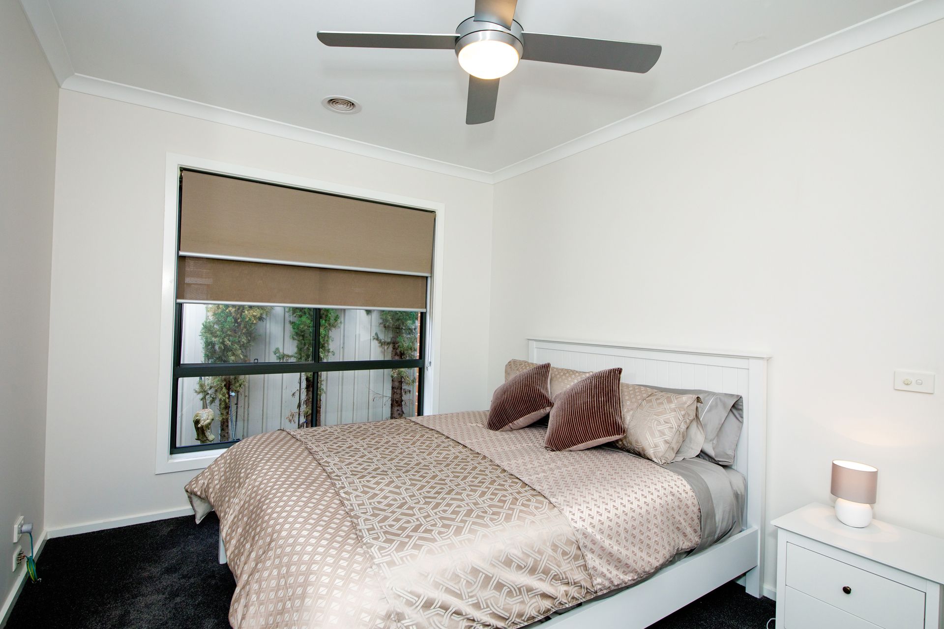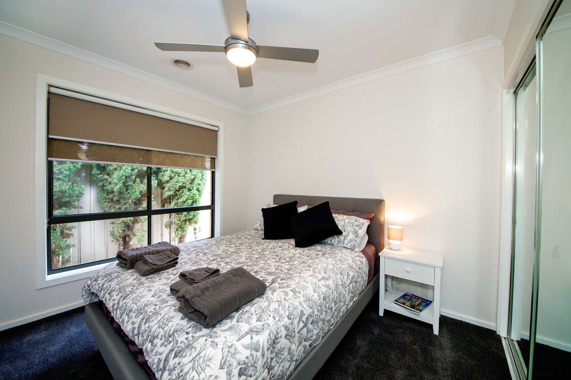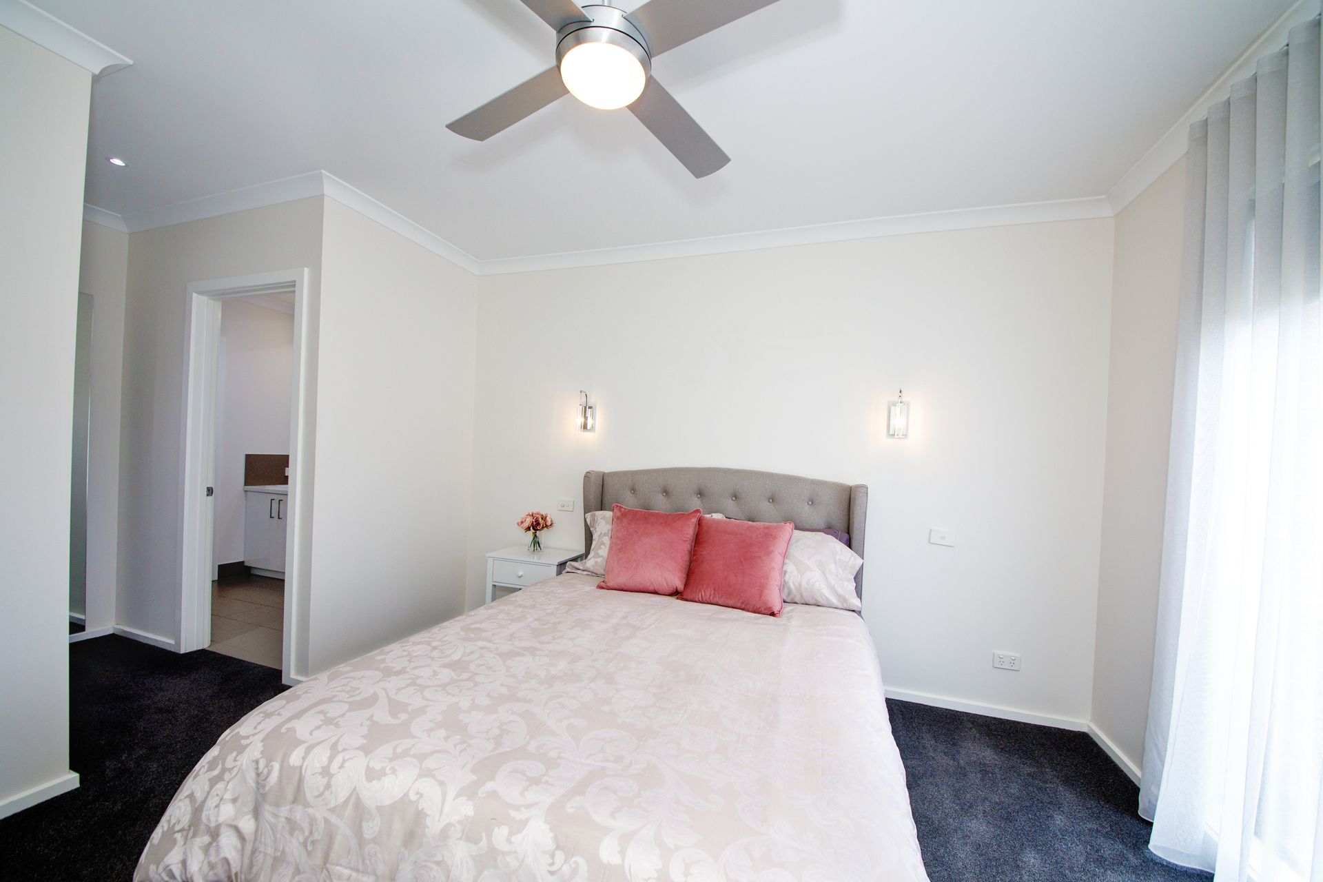 The main bedroom has a Queen sized bed, overhead fan, a walk-in robe and ensuite.