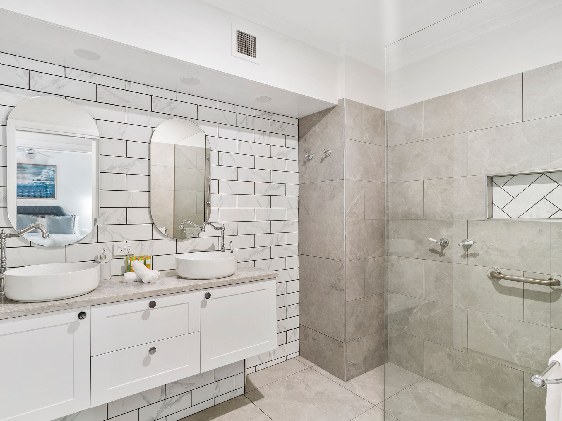 • Bedroom 1: Queen bed with a smart TV and an ensuite bathroom