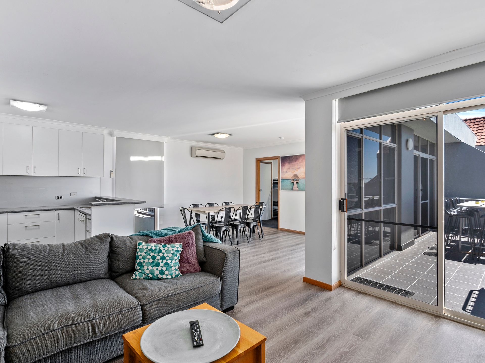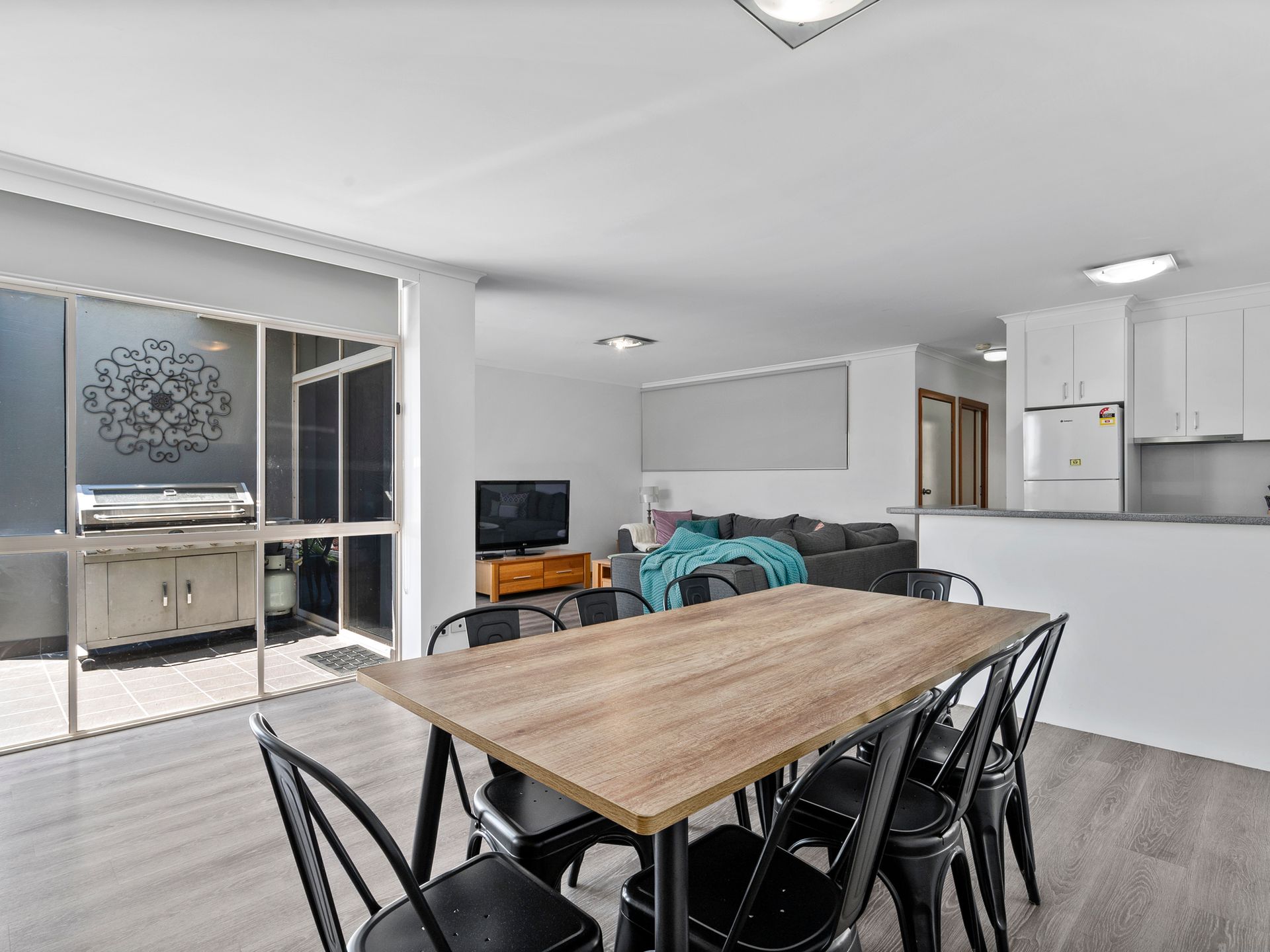 The living space is spread out in the open-plan lounge with an 8-seater dining table and comfy 6-seater couch.